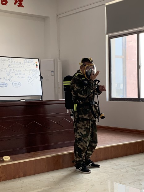 消防隊長姜正海親自示范空氣呼吸器的佩戴方法,并詳細介紹了產(chǎn)品結構,維護,注意事項,故障及維修等問題。同時親自指導員工如何穿戴消防服,并告知穿戴要領。